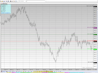 New Crop Corn is worth looking at as we head into next Tuesday’a report. You can see the congestion we’ve had here near $4.17 and $4.20…. This level of congestion has come into play over the past 20 weeks. Certainly over the past 3 months, its been a significant level. Why? In my opinion, its due to the fact that $4.17 is the 38% retrace ment of 2014’s 1.45 melt down. The high? May 9th…. $5.09… That price was the peak for 2014 Marketing year for CZ15. Its the highest price we’ve seen in CZ15 for 18 months. Fast forward to the recent contract low at 3.64 1/4. 4.18 is the 38% RT 4.34 is the 50% RT 4.50 is the 62% RT When folks are wondering whey we these levels matter, all I can say is, They do. For better or worse these Fibonacci numbers always come into play. 99% of folks won’t admit they pay any attention to them. They are being less than truthful, in my opinion. Consider this,, “Profitability” for most US corn producers is near $4.50. We might very well get a spike up there. I’d have my orders waiting to sell at $4.45 through 4.48 so I don’t miss that sale trying to get that print. Sell it two cents lower and lie down at the coffee shop about the other 2 cents. Consider this, if the delta continues to be wet, and those farmers switch to beans,, you probably have more pressure on beans. More acres on beans as well. The average guess is 88.5 Million acres of corn plantings and 87.5 million acres of beans. If we get less corn acres planted and we get a weather issue, that’s a story line that lets you see a good spike higher in CZ prices. CZ is the new crop. Its the crop that has yet to be planted. If we get a hard break here, it might be a good place to buy cheap calls to try and capitalize on a Summer market before it ever gets started. See Chart Below