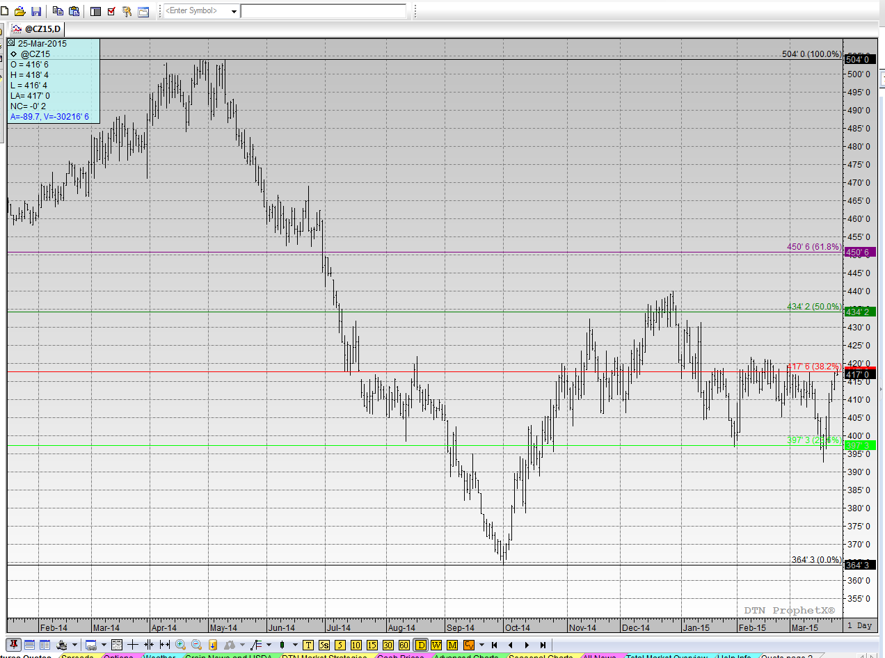 New Crop Corn is worth looking at as we head into next Tuesday’a report. You can see the congestion we’ve had here near $4.17 and $4.20…. This level of congestion has come into play over the past 20 weeks. Certainly over the past 3 months, its been a significant level. Why? In my opinion, its due to the fact that $4.17 is the 38% retrace ment of 2014’s 1.45 melt down. The high? May 9th…. $5.09… That price was the peak for 2014 Marketing year for CZ15. Its the highest price we’ve seen in CZ15 for 18 months. Fast forward to the recent contract low at 3.64 1/4. 4.18 is the 38% RT 4.34 is the 50% RT 4.50 is the 62% RT When folks are wondering whey we these levels matter, all I can say is, They do. For better or worse these Fibonacci numbers always come into play. 99% of folks won’t admit they pay any attention to them. They are being less than truthful, in my opinion. Consider this,, “Profitability” for most US corn producers is near $4.50. We might very well get a spike up there. I’d have my orders waiting to sell at $4.45 through 4.48 so I don’t miss that sale trying to get that print. Sell it two cents lower and lie down at the coffee shop about the other 2 cents. Consider this, if the delta continues to be wet, and those farmers switch to beans,, you probably have more pressure on beans. More acres on beans as well. The average guess is 88.5 Million acres of corn plantings and 87.5 million acres of beans. If we get less corn acres planted and we get a weather issue, that’s a story line that lets you see a good spike higher in CZ prices. CZ is the new crop. Its the crop that has yet to be planted. If we get a hard break here, it might be a good place to buy cheap calls to try and capitalize on a Summer market before it ever gets started. See Chart Below